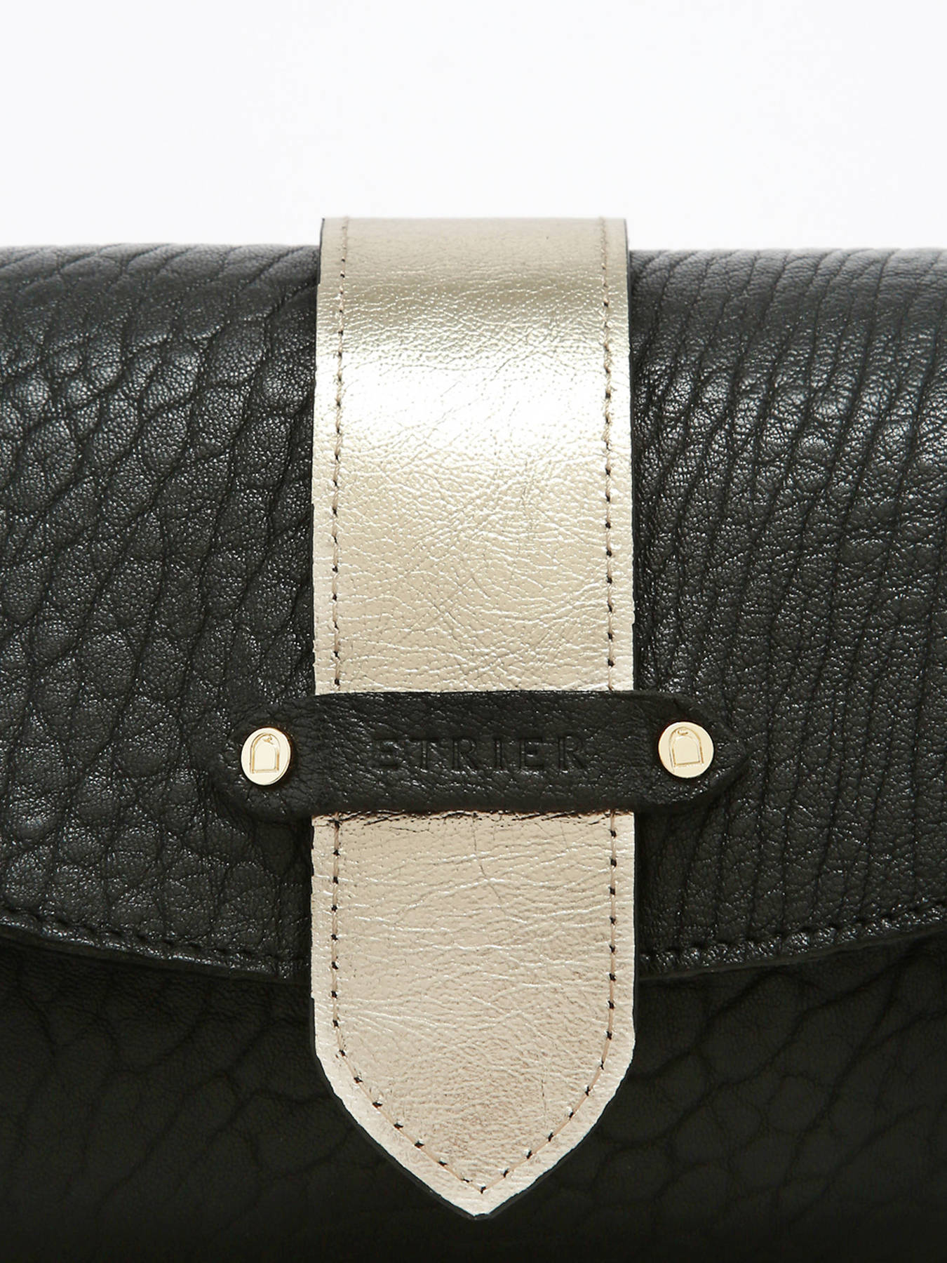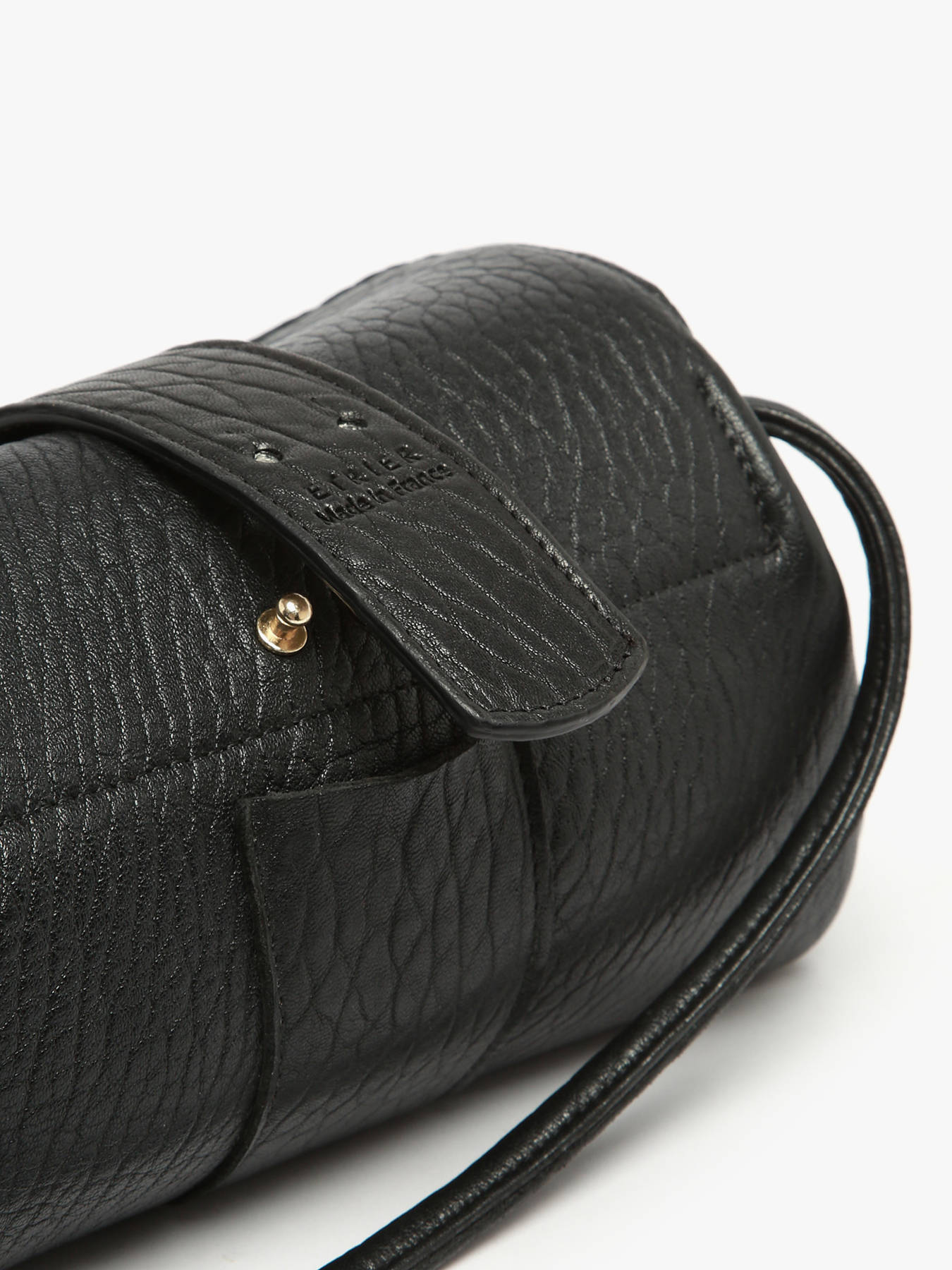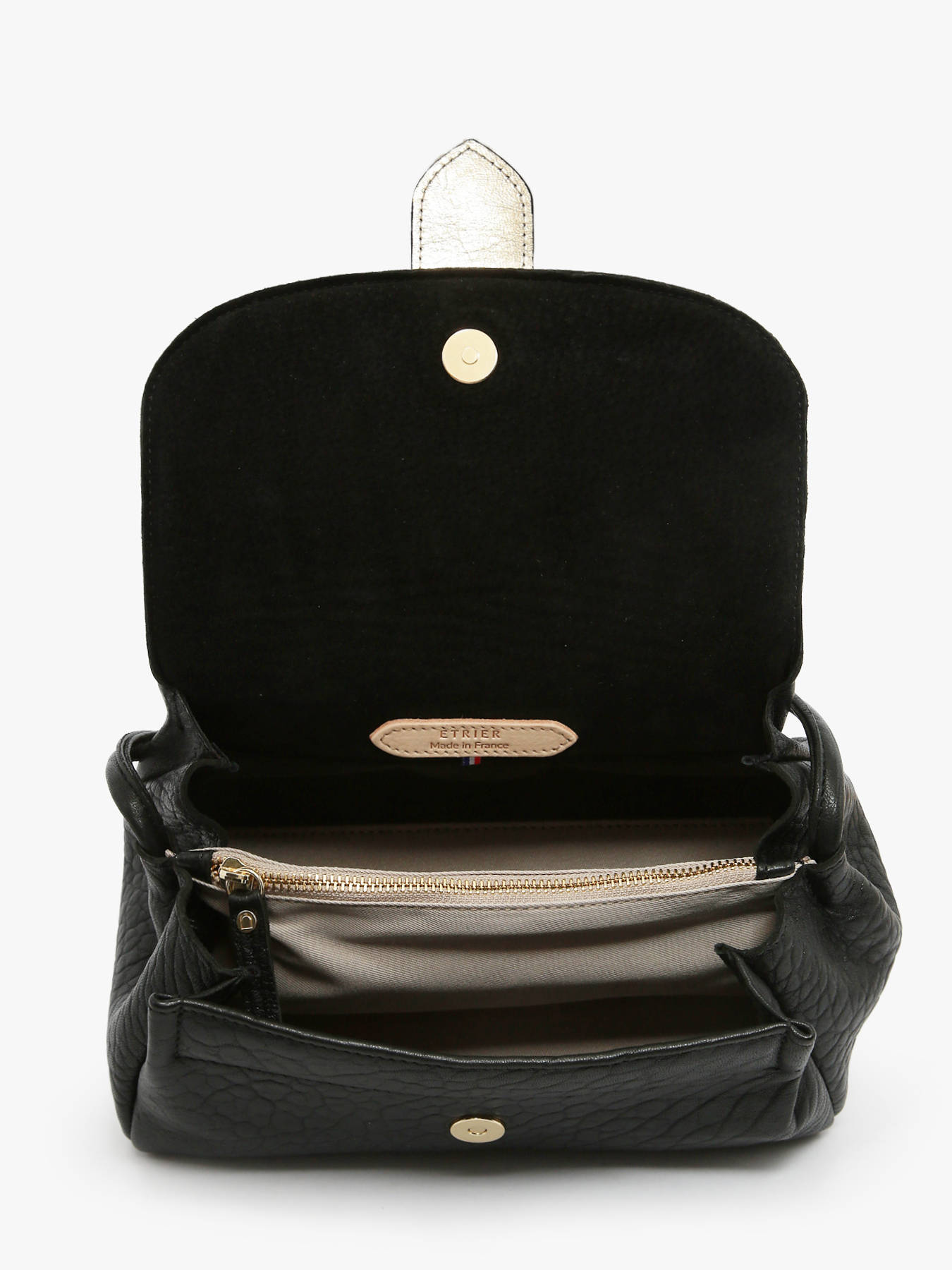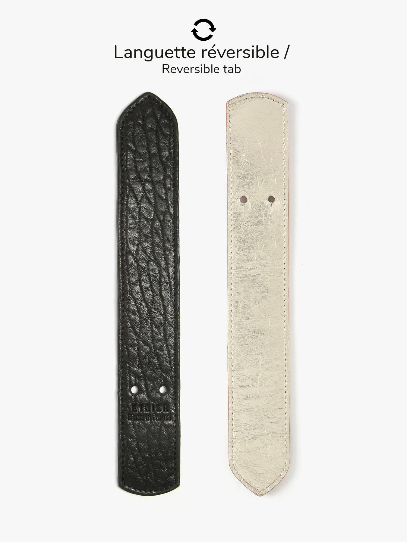 The AGNES crossbody bag by ETRIER is crafted from French crinkled lambskin leather. This model is shown here in size M and features a flap closure secured with a magnetic snap button. It is also available in size S for those who prefer a more generous capacity. This version comes with a reversible tab: one gold side and one side in matching leather, allowing you to personalize your bag depending on your style. The tab attaches easily thanks to two collar buttons and conveniently slips into a dedicated pocket at the back of the bag. The leather-lined interior includes three compartments, including a central zipped section, offering effortless organization for your personal belongings. The structured base ensures the bag maintains its shape over time. The natural leather patch embossed with the ETRIER logo is adorned with a small French flag, adding a refined and distinctive touch. The leather shoulder strap is set to 130 cm upon delivery and can be easily adjusted in height by retying the discreet knot inside the bag. Simply pull, untie the knot, adjust the length, and re-knot to achieve the perfect fit. Combining French craftsmanship with practical elegance, this bag is both timeless and versatile. For even more personalization, discover our collection of printed statement tabs available on our website.